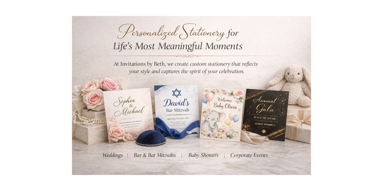 At Invitations by Beth, every design begins with your vision. Whether you're planning a wedding, bar or bat mitzvah, baby shower, birthday, or corporate event, we create custom stationery that reflects your style and captures the spirit of your celebration.